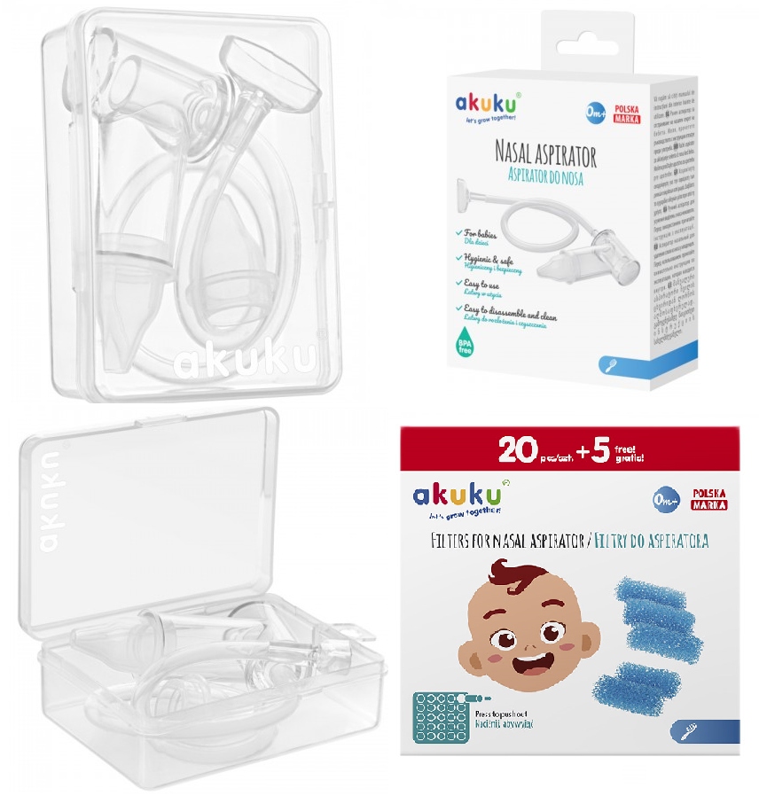 ✅ Wymienne filtry do aspiratora AKUKU powstrzymujące wydzielinę z noska przed przedostaniem się do wężyka z ustnikiem i tym samym przed ewentualnym zarażeniem się osoby oczyszczającej nosek dziecku.