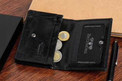 Piękne, skórzane etui na karty, dokumenty/ mały portfel w czarnym kolorze marki Beltimore®. Etui dedykowane jest zarówno dla kobiet jak i mężczyzn.