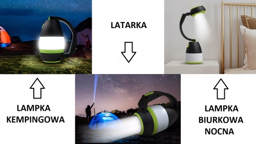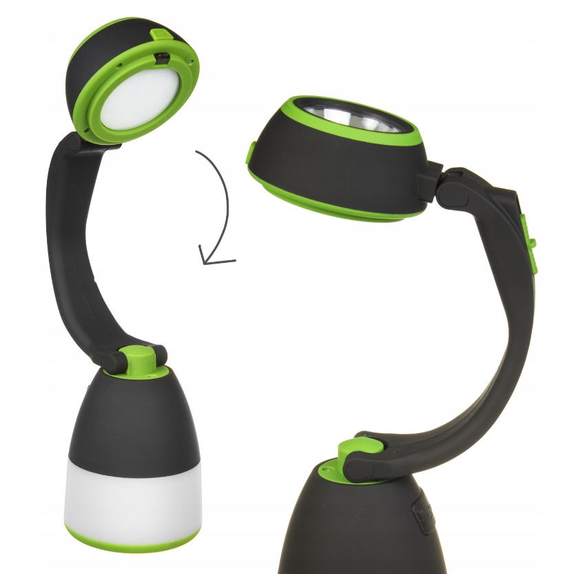 Może służyć jako latarka lub lampka kempingowa, a po rozłożeniu również jako lampa biurkowa.