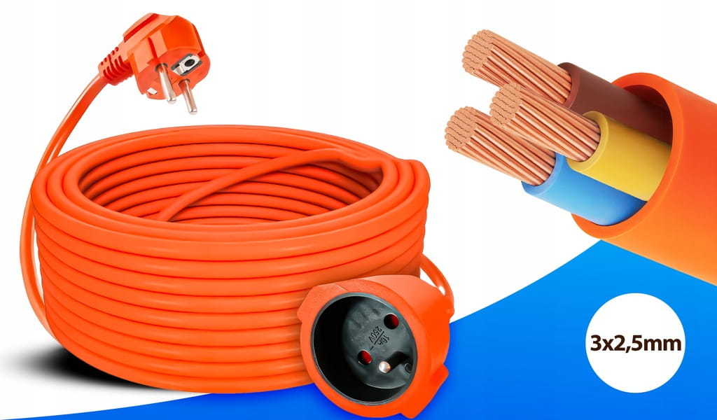 PRZEDŁUŻACZ KABEL OGRODOWY DO KOSIARKI 10M BUDOWLANY GRUBY SZNUR 3x2,5mm