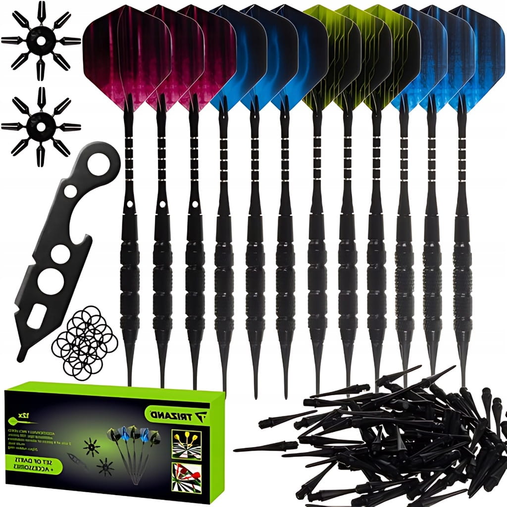 ✅ DUŻY ZESTAW 135w1 – jest to kompletny zestaw do gry w Darta. Całość jest wyposażona w 12 rzutek, 100 miękkich grotów, 2 ochraniacze lotu, 20 o-ringów oraz 1 narzędzie wielofunkcyjne.
